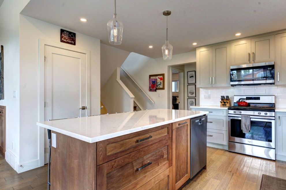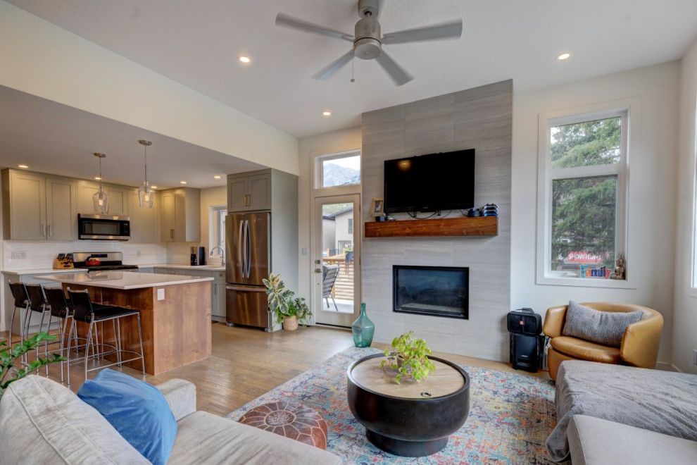 Perfectly positioned a short walk from downtown Canmore, this beautifully designed home spans three spacious levels and offers an exceptional blend of style, comfort and functionality. The main floor boasts an open-concept layout featuring a modern kitchen, dining area and living room with vaulted ceilings and a striking fireplace as the centrepiece. Step out onto the expansive deck to take in breathtaking mountain views. This level also includes two well-appointed bedrooms and a full bath.